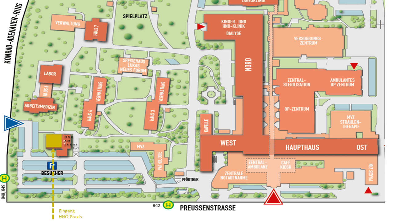 You will find our practice on the premises of the Lukas Hospital in Neuss. We are therefore optimally connected to the public transport network and the nearest bus stop for lines 849 and 842 is a 1-minute walk away. Or park conveniently and inexpensively in the Lukas car park.